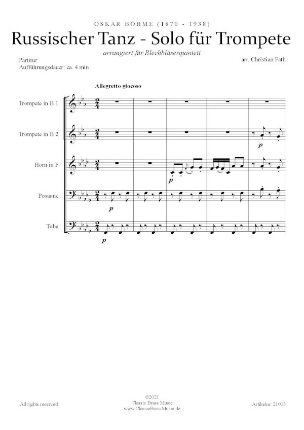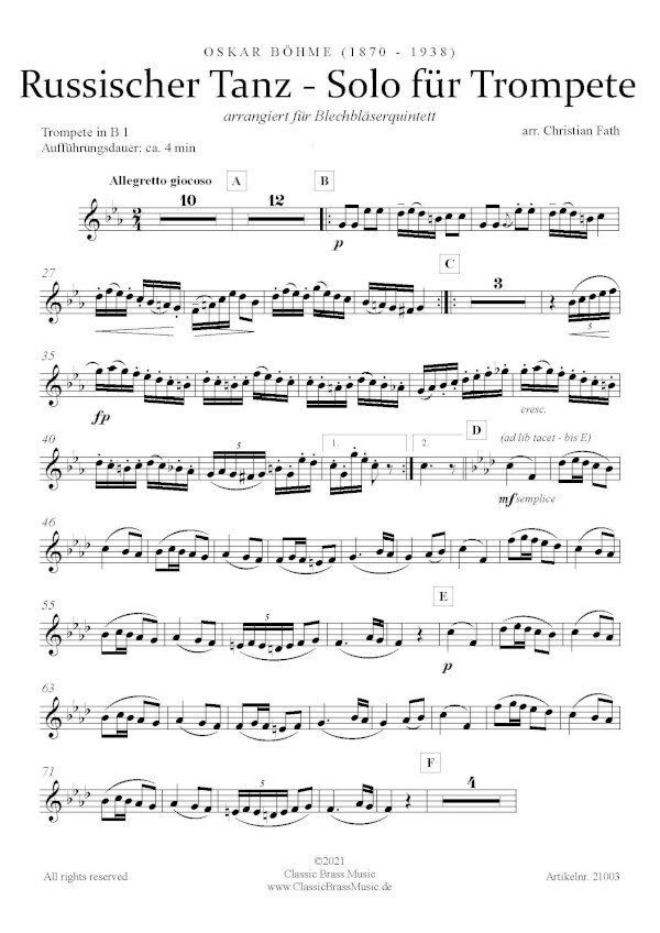 Das viruose Trompetensolo von Oskar Böhme, ist wohl jedem Blechbläser ein Begriff. Während das Solo an sich gleich belassen wurde und dem Solisten der Raum zum Glänzen erhalten bleibt, wird der Klavierpart nun von den vier verbleibenden Musikern des Blechbläserquintetts übernommen. Gönnen Sie sich und Ihrem Publikum einen Spaß mit dem Trompetenglanzstück von Oskar Böhme.