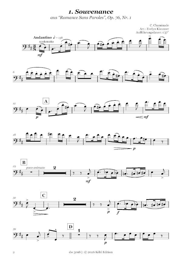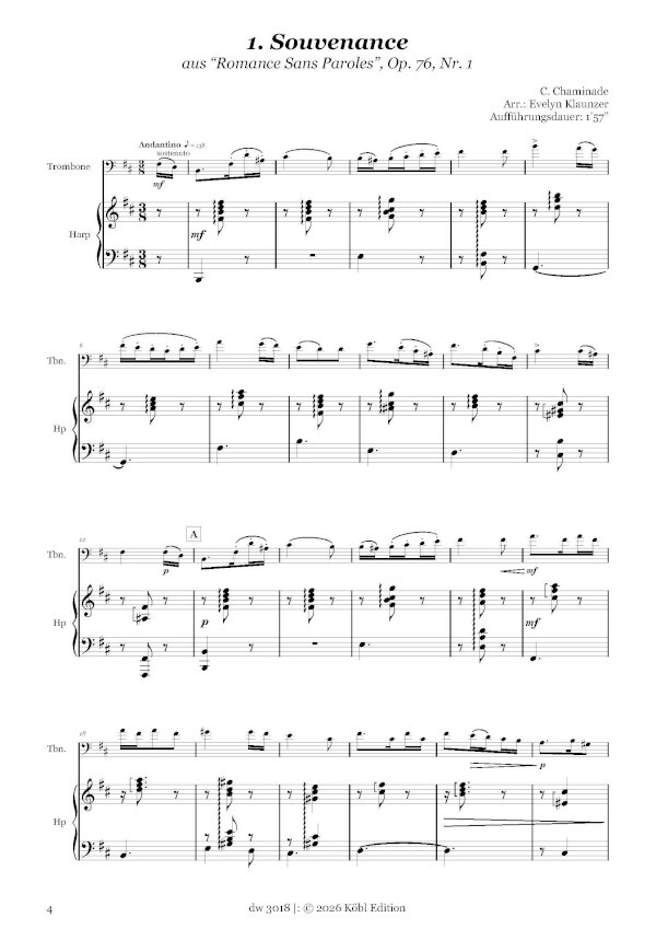 Original für Posaune und Harfe. Die Stücke können aber auch mit Klavier anstatt von Harfe begleitet werden.
