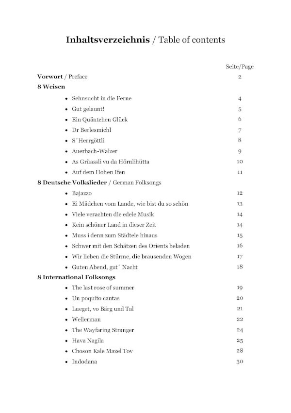 Internationale Folk Songs: The last rose of summer, Un poquito cantas, Lueget, vo Bärg und Tal, Wellerman, The Wayfaring Stranger, Hava Nagila, Choson Kale Mazel Tov, Indodana