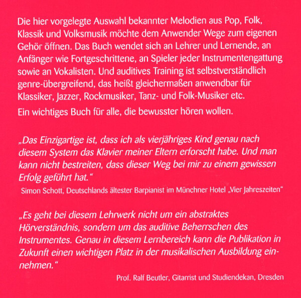Das Buch entstand aus der Erkenntnis heraus, dass im theoretischen wie im praktischen Musikunterricht dem ursprünglich wichtigsten Faktor der Musik zu wenig Bedeutung beigemessen wird: dem musikalischen Gehör. Während das intellektuelle oder kognitive Moment nach Meinung des Autoren deutlich überbewertet wird, bleibt die Bedeutung des auditiven Moments in vielen Veröffentlichungen unterbewertet. Die hier vorgelegte Auswahl bekannter Melodien aus Pop, Folk, Klassik und Volksmusik möchte dem Anwender Wege zum eigenen Gehör öffnen. Das Buch wendet sich an Lehrer und Lernende, an Anfänger wie Fortgeschrittene, an Spieler jeder Instrumentengattung sowie an Vokalisten. Und auditives Training ist selbstverständlich genre-übergreifend, das heißt gleichermaßen anwendbar für Klassiker, Jazzer, Rockmusiker, Tanz- und Folk-Musiker etc. Ein wichtiges Buch für alle, die bewusster hören wollen.