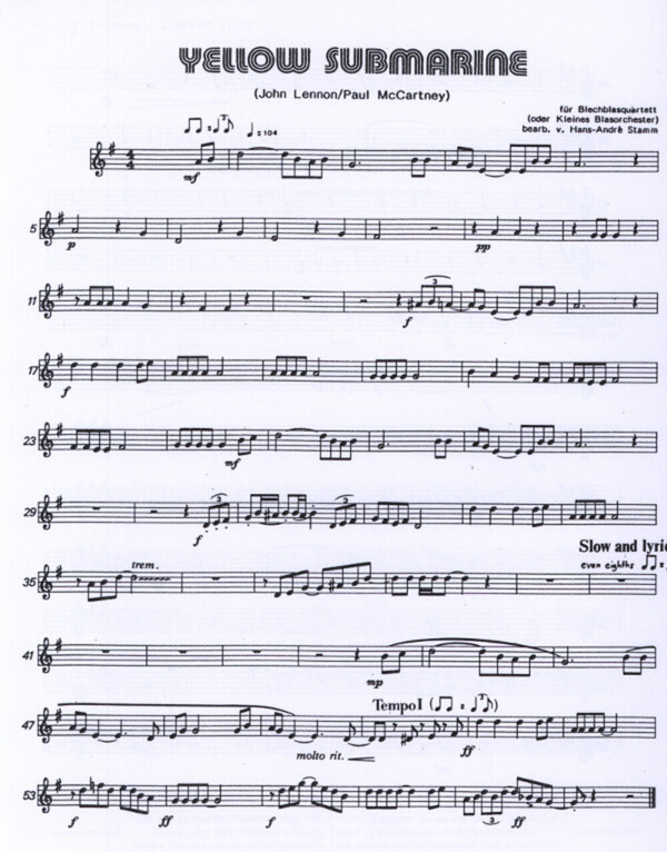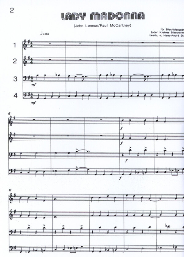 mit: Lady Madonna Yellow Submarine 1. Stimme in C/B 2. Stimme in B/Es/C 3. Stimme in F/B/Es/C im Baßschlüssel + 4. Stimme in B/C im Baßschlüssel