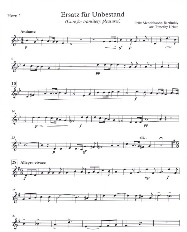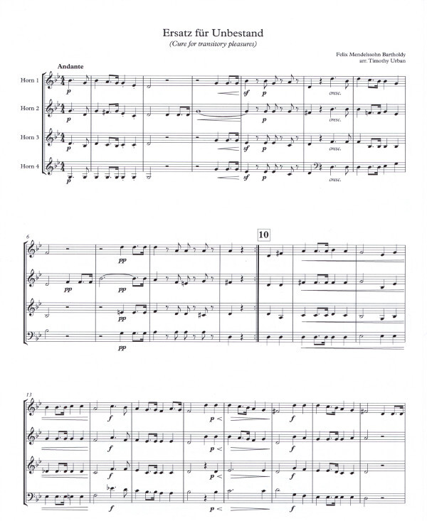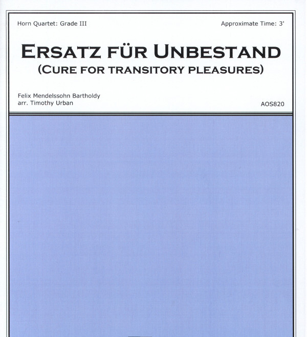 "Ersatz für Unbestand" (Cure for transitory pleasures) was composed by Feliz Mendelssohn-Bartholdy in 1839 for Male Choir. It is arranged here for Horn Quartet.
