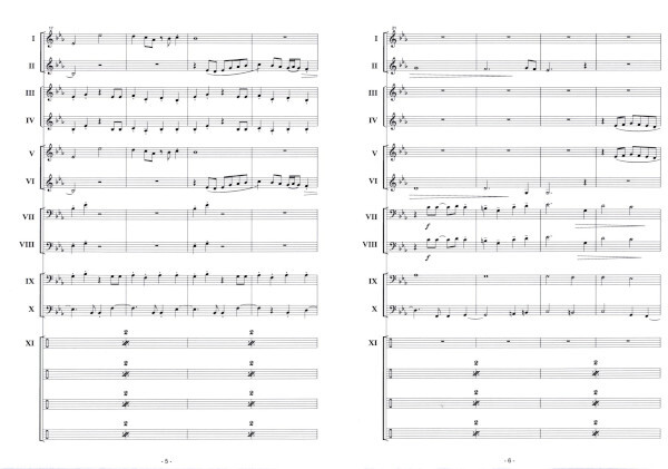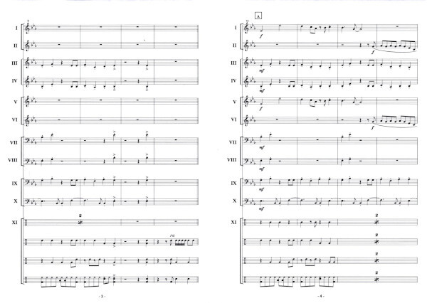 I Flöte, Oboe; Eb Flügelhorn, Klarinette 1, Sopransax, Kornett (b.b.) II Klarinette, Flügelhorn II-III, Flügel (b.b.), Altsax, Altklarinette III Horn 1+2, Englisch Hornsolo1 (b.b.), Altklarinette, Altsax ad lib. IV Horn 3+4; Horn 2 (b.b.), Bariton 1(b.b.), Altklarinette, Tenorsax ad lib V Trompete1; Kornett(b.b.)