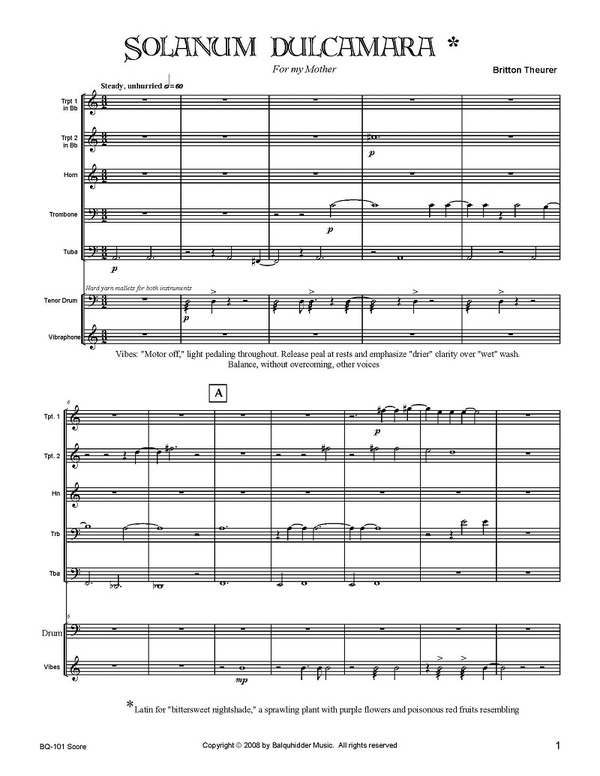 I composed Solanum Dulcamara in June 2006, when I learned of my mother's terminal cancer. It tries to convey a measured, surface austerity that can barely contain its deep sadness and wonder at the perceived fragility and transience of goodness, beauty, and being. Solanum dulcamara is Latin for bittersweet nightshade, a sprawling plant with purple flowers and poisonous red fruits resembling berries and stems that taste bitter then sweet when chewed. (Encarta English Dictionary) - B.T.