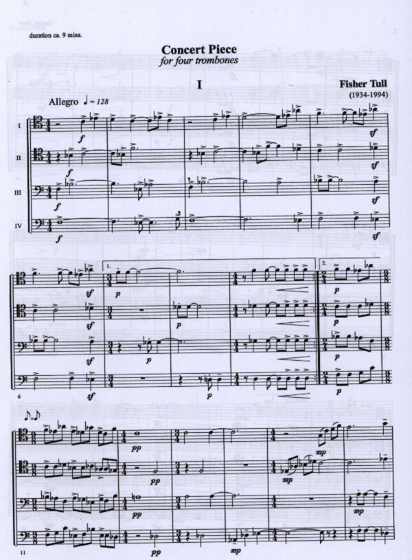Concert piece for four trombones was composed in 1968. The three movements are set in the traditional fast-slow-fast. The highly energetic and rhytmically charged outer movements are contrasted by the lyrical melody and legato accompaniment in the middle movement.