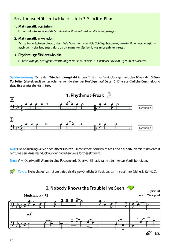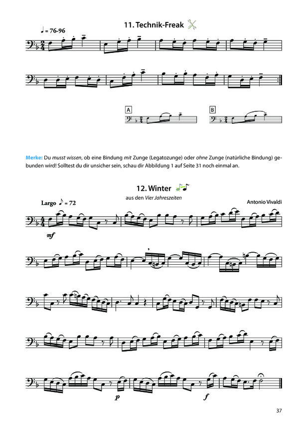 Zahlreiche Stücke, Duette, Rhythmusübungen und Tonleiterstücke mit praxisnahen Spielanweisungen